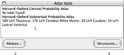 Click on the "Structures..." button (3) to open an atlas inspector dialog which will allow you to browse the structures in any given atlas. Checkboxes on the Atlas Inspector control whether the cursor jumps to the selected structure and if the structures probabilty map should be shown.